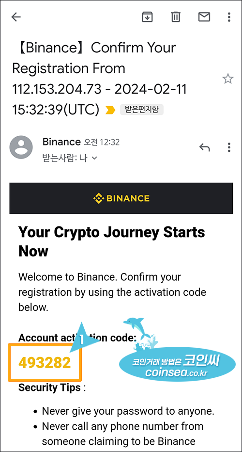 5. 이렇게 바이낸스에서 이메일이 도착하는데 중간에 있는 6자리 인증번호를 위의 화면에 입력해주시면 됩니다.