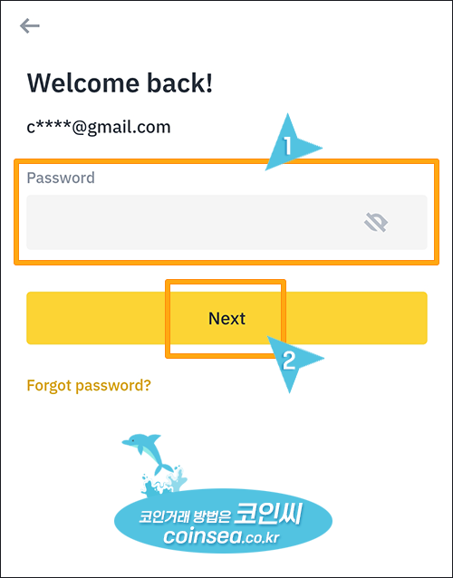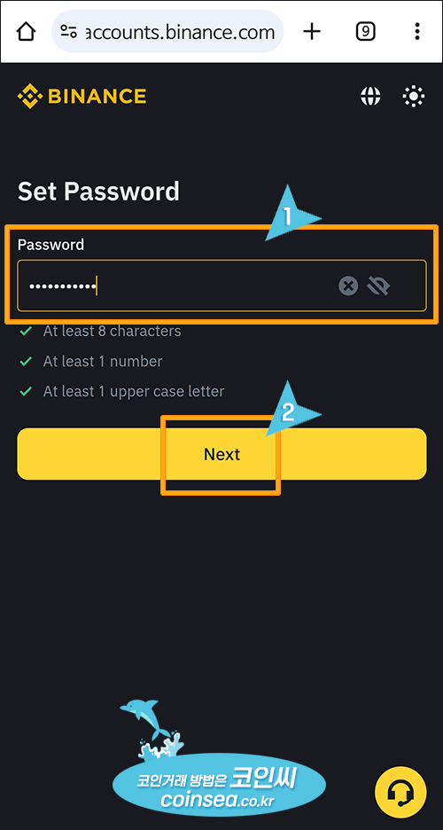 6. 바이낸스 로그인시 사용할 비밀번호를 입력한 후 "Next" 버튼을 클릭합니다. 비밀번호는 영문, 숫자, 특수문자 포함하여 8자리 이상으로 작성하여야 합니다.