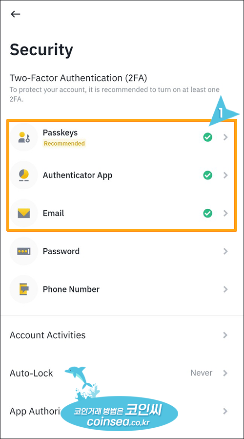 7. 자산 보호를 위해서 패스키(Passkeys)나 Authenticator App인 구글 OTP 설정을 해야 합니다. 둘 중에 하나만 해도 되고 둘 다 하셔도 되는데 바이낸스에서 추천(Recommended)하는 방식은 패스키 방식입니다. 패스키는 지문인식과 같은 생체인식을 등록하는 방식이고, Authenticator App은 구글OTP와 같이 인증번호를 등록하는 방식입니다.