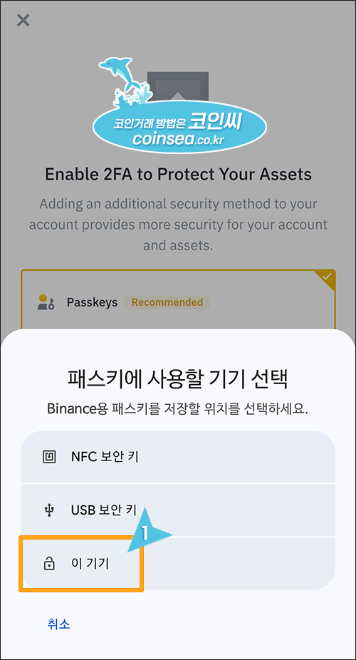 8. 패스키에 사용할 기기 선택에서 본인의 휴대폰을 이용해서 가입하신 것이라 "이 기기"를 선택하시면 됩니다.
