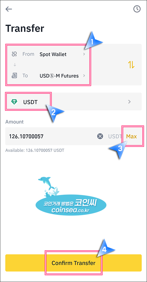 지금은 USDT를 이용한 선물거래를 하기 위해 리플을 USDT로 변환했으므로, USDT를 USDⓢ-M Futures 지갑으로 보내려고 합니다. From은 Spot Wallet, To는 USDⓢ-M Futures를 선택하고, 코인은 USDT, 그리고 Max 버튼을 눌러서 전량 선택을 한 후, Confirm Transfer를 클릭해주세요.