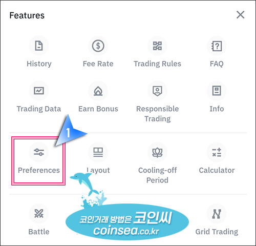 우측의 봉차트 모양은 선물거래 차트를 볼수 있는 버튼이고, 8자 모양은 코인을 교환할 수 있는 Convert 버튼입니다. 그리고 점 세개(...) 표시를 클릭하면 수많은 바이낸스의 기능들이 있습니다. 리더보드를 클릭하시면 실시간 수익률 순위와 수익금 순위를 확인할 수 있습니다. 그리고 Layout을 클릭하면 선물거래 화면을 본인이 편리한대로 약간 변형을 할 수 있습니다. 특히 Preferences에서는 양방향 포지션 설정을 할 수 있습니다.