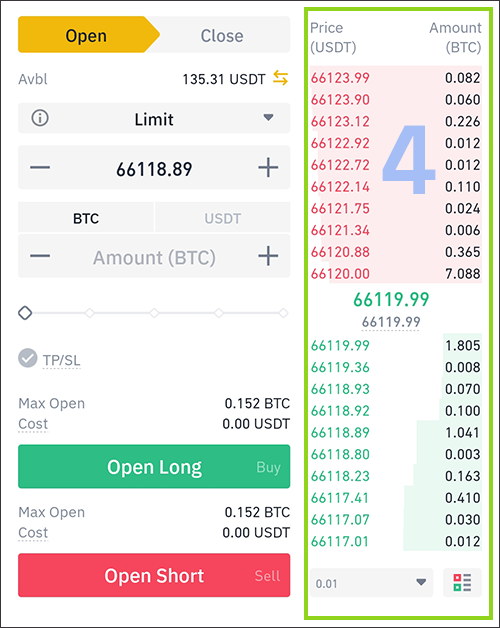 4. 이곳은 호가창으로 중간에 있는 녹색글씨의 66119.99가 현재가 이며, 그 아래에 있는 회색 66119.99는 시장평균가입니다. 시장평균가가 왜 중요하냐면 모든 강제청산은 현재가가 아닌 시장평균가로 이루어집니다. 현재가로 강제청산이 이루어지면 거래소가 시세를 조작할 수도 있고 가격 왜곡현상이 발생할 수도 있기 때문에 여러 거래소들의 평균가격인 시장 평균가로 강제청산을 이루어집니다.