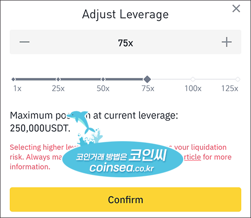 Adjust Leverage는 레버리지 조정할 수 있는 메뉴입니다. 참고로 포지션을 잡은 후에 레버리지 조정은 아무런 의미가 없습니다. 예를 들자면, 100만원으로 10배 레버리지를 해서 총 1000만원어치 포지션을 잡았는데, 이익이 발생해서 레버리지를 100배로 높이면 수익이 10배가 더 늘어나는 것이 아니라, 포지션을 잡은 후에는 레버리지 변경해도 총 투자금액인 1000만원은 그대로 유지되고 레버리지가 10배에서 100배로 높아지니까 증거금이 그만큼 필요없게 되어 90만원은 사용가능한 자산으로 환불됩니다.