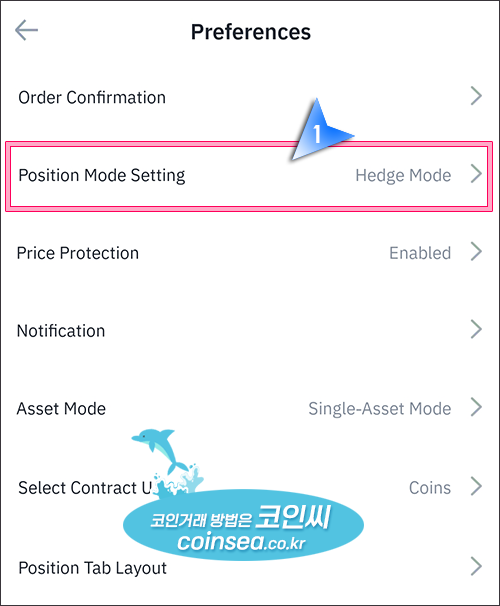 Preferences에서 Postion Mode Setting을 클릭하면 단방향 거래를 할 것인지? 양방향 거래를 할 것인지 선택이 가능합니다.