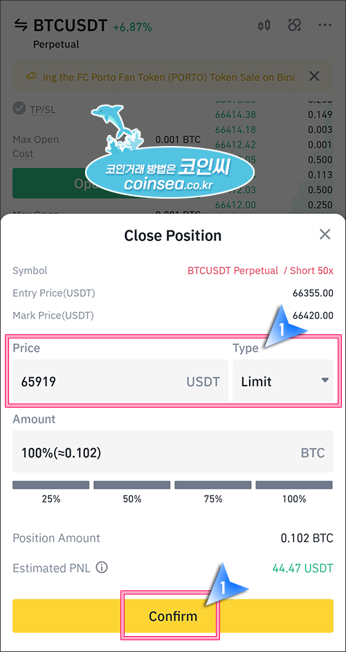 9. 아래는 포지션을 시장가로 빠르게 정리하는 방법입니다. Limit 부분을 눌러서 Market로 해놓은 상태에서 하단의 Confirm을 클릭하시면 곧바로 현재가로 포지션이 종료됩니다.