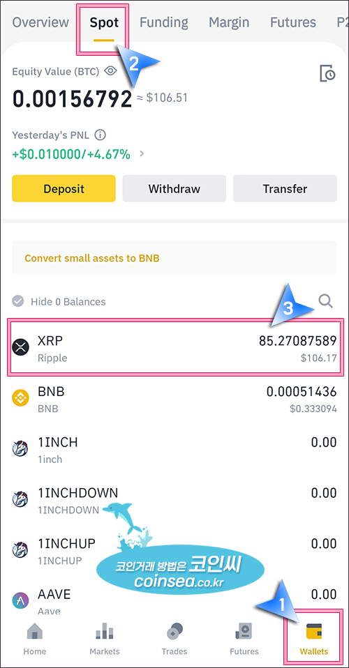 9. 앱 하단의 Wallets를 클릭한 후, Spot(현물지갑)에서 리플을 클릭합니다.