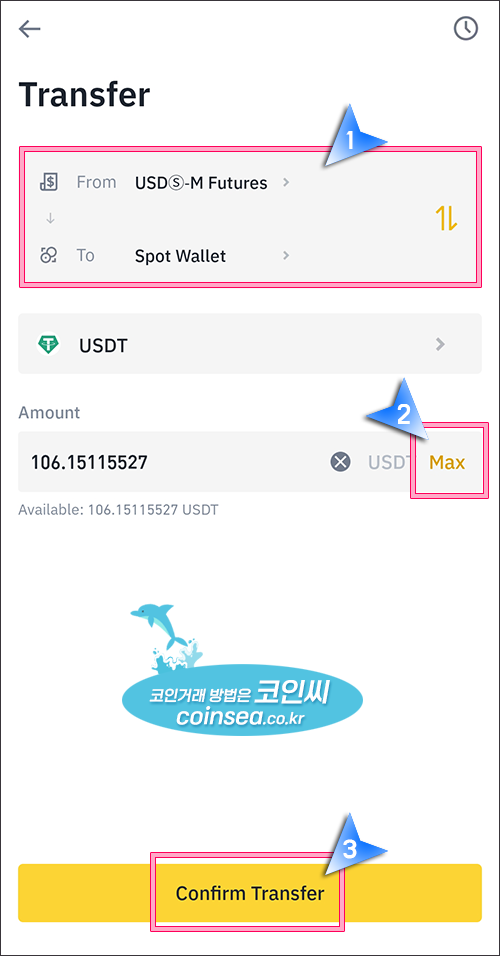 2. 전송화면으로 이동하면 From을 USDⓢ-M Futures(선물지갑), To를 Spot Wallet(현물지갑)으로 놓고, Amount(수량)를 직접 입력하거나 우측의 Max를 누르시면 전량 선택됩니다. 그리고 하단의 Confirm Transfer 버튼을 눌러주시면 현물지갑으로 USDT가 이동됩니다.