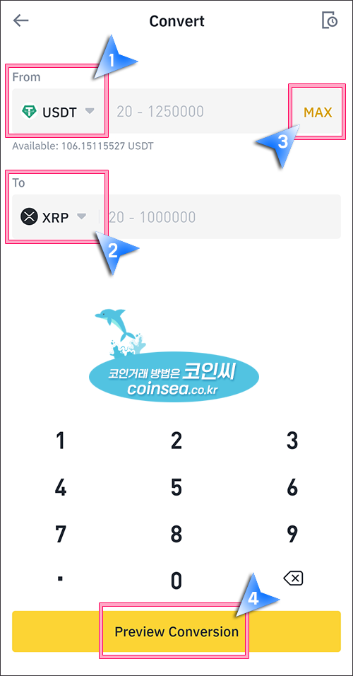 6. Convert에서 From을 바꾸려는 USDT로 놓고, To를 리플인 XRP로 선택한 후, USDT 우측의 MAX를 누르시고 하단의 Preview Conversion(변환 미리보기)를 클릭합니다.