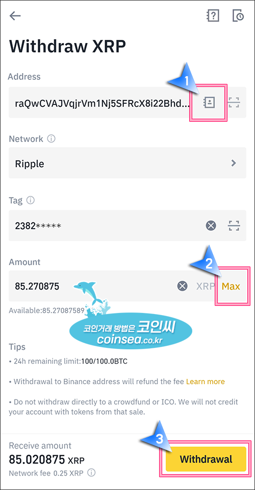 15. 다시 출금 입력창으로 돌아와서 주소록에서 방금 입력한 국내거래소 주소를 선택하시면 내용들이 자동으로 입력됩니다. 다음부터는 이 주소록 아이콘만 클릭해주시면 주소와 태그 등을 따로 입력하지 않아도 됩니다. 출금할 수량(Amount)를 직접 입력하거나 전량 출금하시려면 우측의 Max 버튼을 누르고 Withdrawal을 클릭합니다.