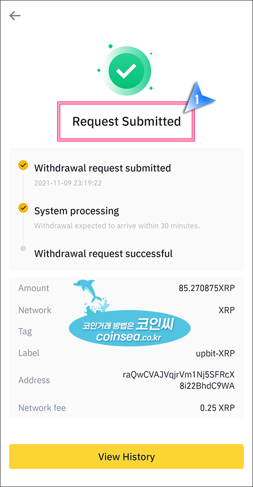 18. 출금 요청이 완료되었습니다. 리플은 대략 5분 내외로 국내거래소에 입금됩니다.