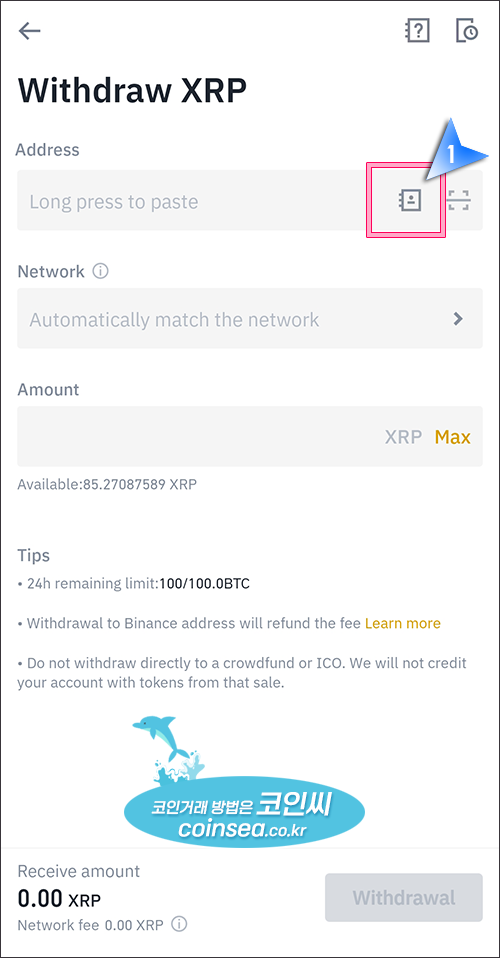 12. 리플의 출금 입력창입니다. 한번만 출금할 것이 아니라 계속해서 수익이 발생하면 출금을 해야하기 때문에 출금 주소록에 미리 출금주소를 등록해두시면 좋습니다. 주소록에 등록하기 위해서 주소록 모양 아이콘을 클릭합니다.