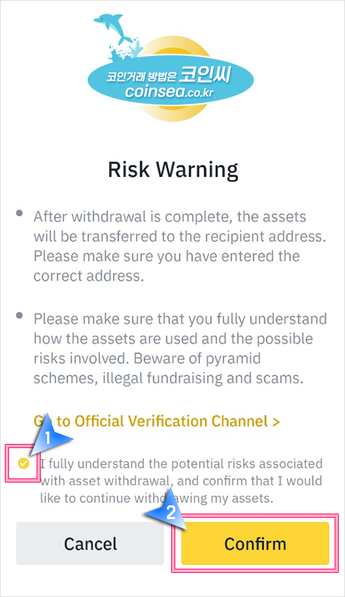 아래와 같은 Risk Warning가 화면이 뜨면 보안 경고에 대해 이해를 했다고 체크하시고 Confirm버튼을 눌러주시면 됩니다.