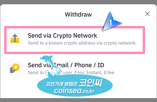 11. 코인을 출금하기에 "Send via Crypto Network를 선택합니다.