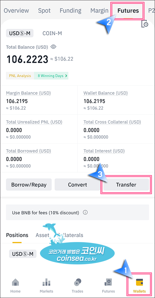 두번째는 Wallets(지갑)을 클릭한 후, Futures(선물지갑)을 선택하고 중간에 있는 Transfer(전송) 버튼을 누르면 됩니다.