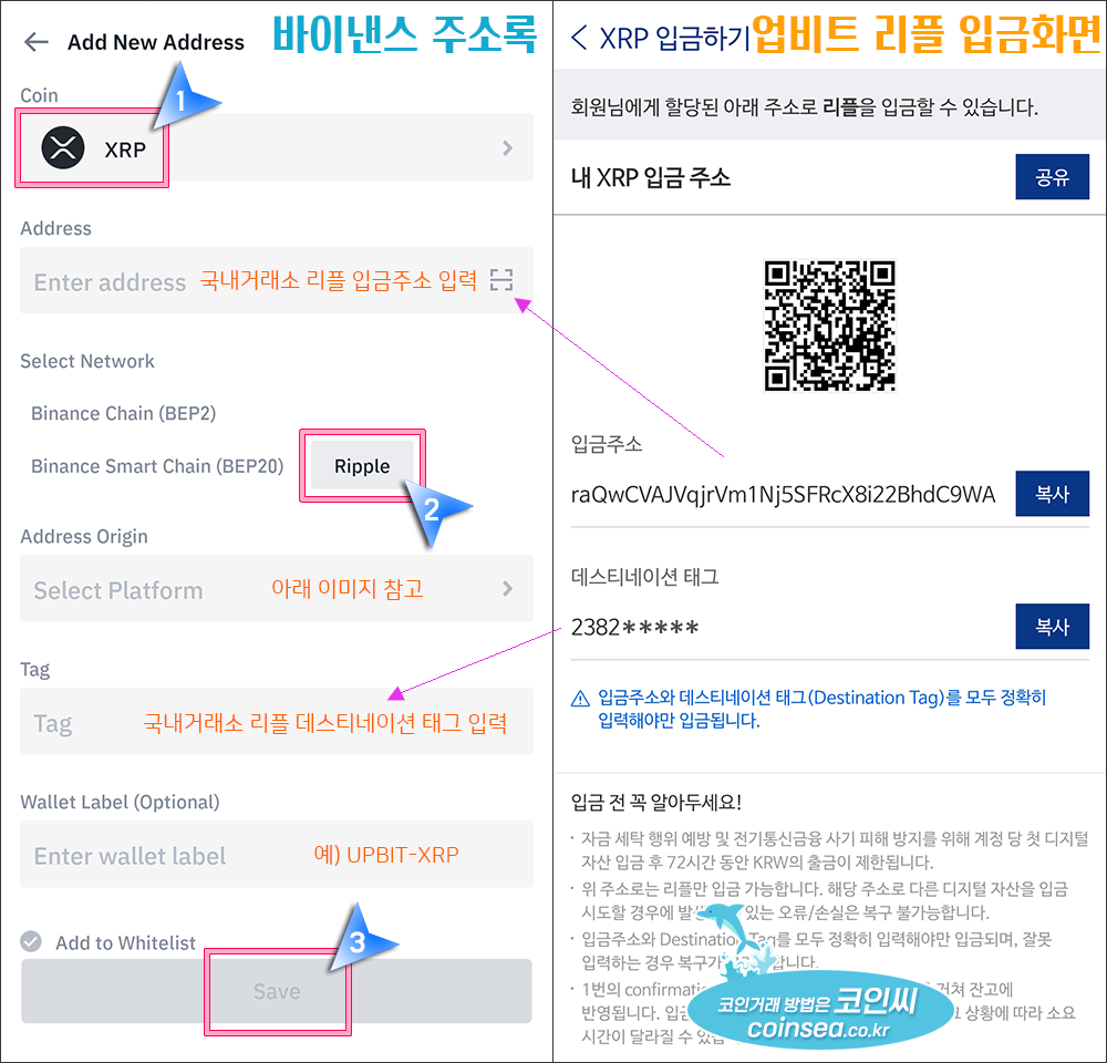 14. 업비트 리플 입금화면과 바이낸스 주소록을 나란히 비교해봤습니다. Address에 국내거래소(업비트) 리플 입금주소를 복사한 후 붙여넣기 하시고, Tag 부분에 국내거래소(업비트) 리플 데스티네이션 태그를 복사한 후 붙여넣기 합니다. Select Network(전송 네트워크 선택)은 Ripple로 선택이 안되어 있다면 선택을 하시고, Address Orgin은 바로 아래에 설명을 해두었으니 참고하시기 바랍니다.