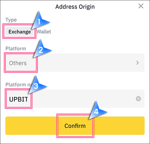 위의 이미지 중간쯤에 있는 Address Orgin 입력 부분 작성요령입니다. Type(타입)은 Exchange(거래소)를 선택, Platform(플랫폼)은 자신이 거래하는 국내거래소를 선택하시고 보기에 없다면 Others(기타)를 선택하고 Platform name에 직접 입력해주시면 됩니다. 업비트 사용자라면 Platform의 보기에 빗썸과 코인원은 있는데 업비트가 없어서 UPBIT라고 입력한 후, Confirm을 클릭하시면 됩니다.