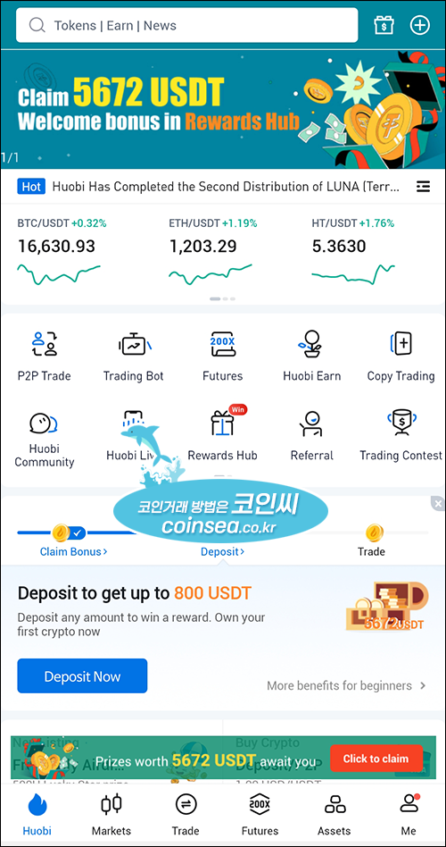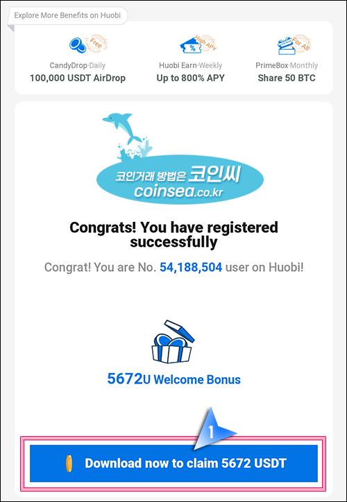 4. 아주 간단히 가입이 완료되었습니다. 후오비는 여러 이벤트를 진행중이므로 하단의 "Download now to claim 5672USDT"를 클릭합니다.