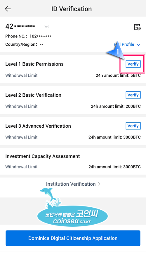 3. 인증은 총 3단계로 나뉘어져 있습니다. 1단계는 개인정보 입력, 2단계는 얼굴 인증, 3단계는 주소지 인증인데 2단계까지만 진행하셔도 충분합니다. 먼저 Leve 1 우측의 "Verify"를 클릭합니다.