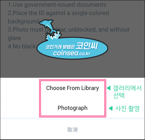 8. 갤러리에서 선택과 사진 촬영이 있습니다. 곧바로 신분증을 촬영하시려면 Photograph를 선택합니다.