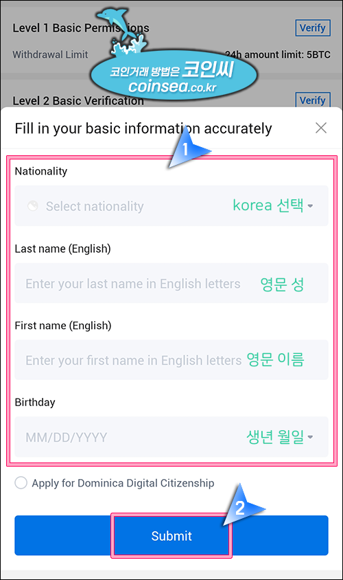 4. 국가 선택과 영문 성, 이름, 생년월일을 입력하고 "Submit"을 클릭합니다.