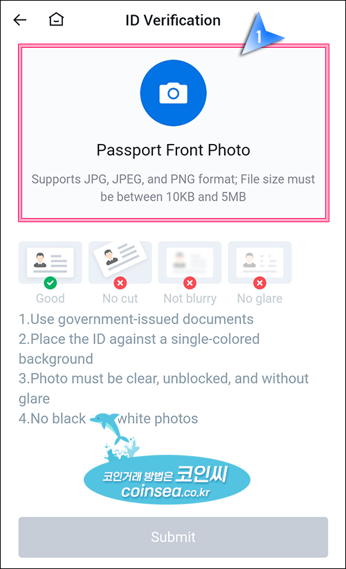 11. 신분증을 올바르게 펴서 선명하게 보이도록 촬영한 후, 올바르게 촬영되었다면 "Submit" 버튼을 클릭합니다. 다시 촬영하려면 업로드된 이미지를 클릭해서 다시 촬영하시면 됩니다.