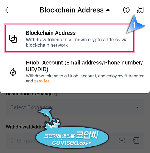 9. 외부 거래소로 보낼 것이라 Blockchain Address를 선택합니다.