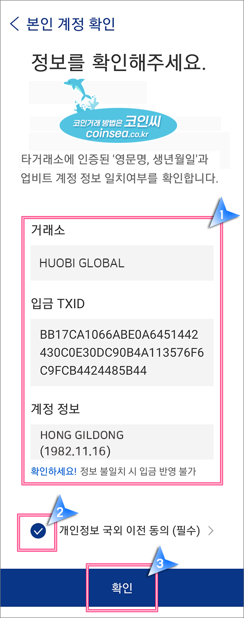 5. 영문명과 생년월일 등의 개인정보를 확인하시고, 개인정보 이전 동의에 체크후 "확인" 버튼을 클릭합니다.