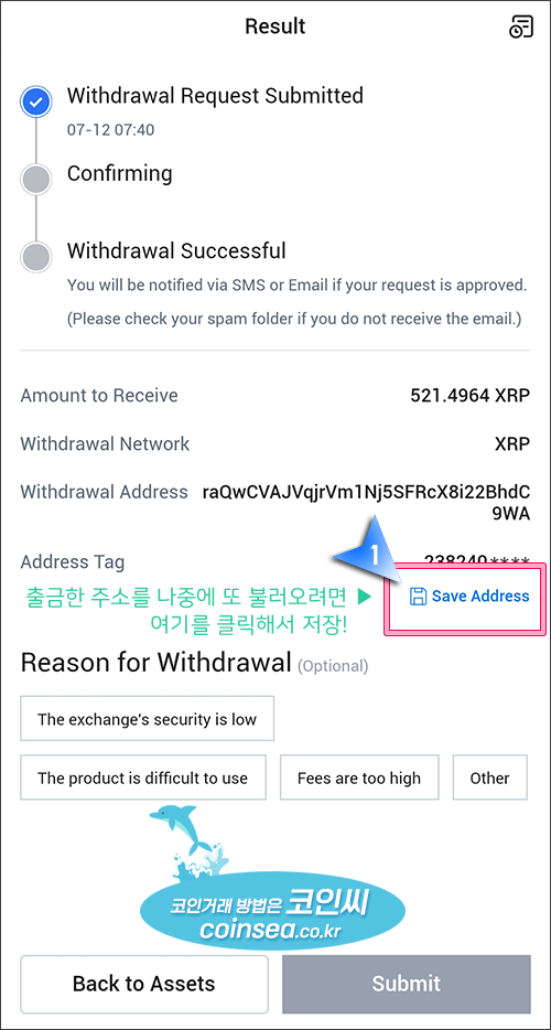 만약 보낸 출금주소를 계속해서 이용하려면 Save Address 버튼을 눌러서 저장해두시면 편리합니다.
