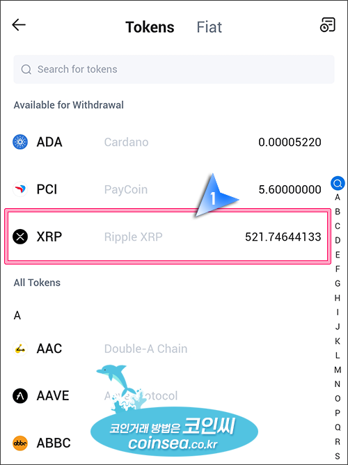8. 토큰 검색창에서 XRP를 선택합니다. 안보인다면 Search for tokens에서 XRP를 검색하시면 됩니다.
