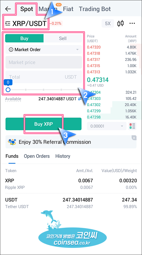 4. Available에 선물지갑에서 보낸 USDT가 입금된 것을 확인할 수 있습니다. 이제 Spot(현물거래)에서 XRP/USDT를 찾고, Buy에서 지정가나 시장가를 선택후 수량을 입력하고 "Buy XRP" 버튼을 클릭합니다.
