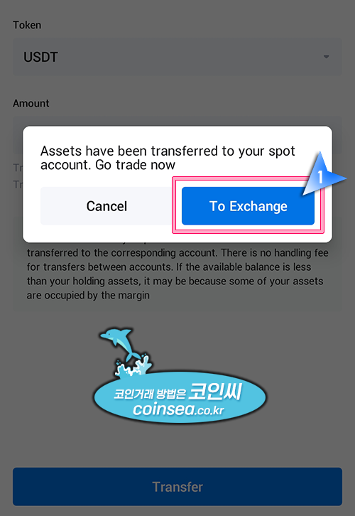 3. 현물지갑으로 자산이 이동되었다는 메시지입니다. USDT를 XRP로 교환하려면 현물거래를 해야 합니다. 현물거래를 위해서 "To Exchange" 버튼을 클릭합니다. 또는 앱 하단의 Trade 버튼을 클릭하셔도 됩니다.