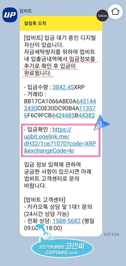 1. 만약 보내는 금액의 평가금액이 원화 기준으로 100만원 이상이다면 곧바로 입금되는 것이 아니라 추가 확인 절차가 필요합니다. 카카오톡으로 도착한 알림톡을 열어서 "입금확인"을 선택합니다.