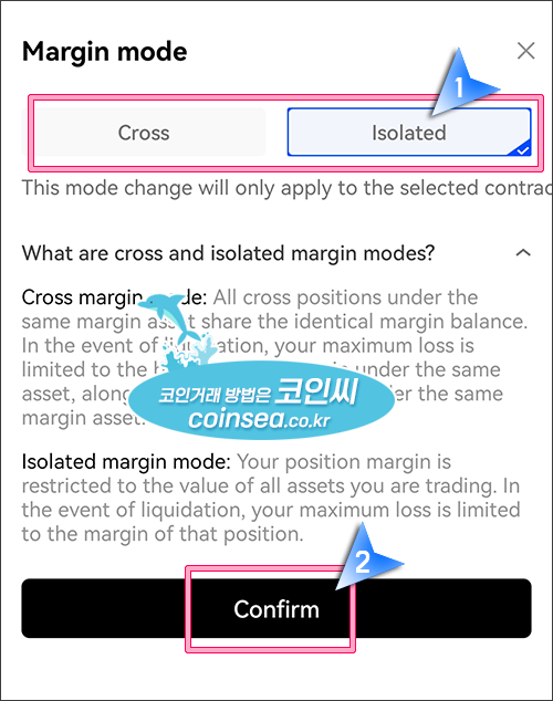 Isolated를 클릭하시면 Cross(교차모드)와 Isolated(격리모드)의 선택이 가능합니다. 교차모드는 선물지갑의 모든 자산을 증거금으로 사용해서 선물거래를 하는 것이라 자동으로 증거금을 늘리고 줄이면서 거래를 하게 됩니다. 하지만 단점은 강제청산이 선물지갑의 모든 사용가능한 자산이 0원이 됩니다. 전체를 증거금으로 사용하기에 강제청산이 전제 금액이 0원이 됩니다.