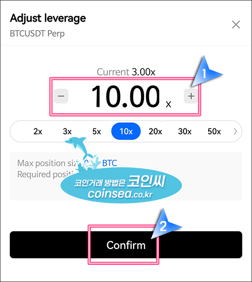 3.00X라고 써있는 부분을 클릭하면 레버리지를 조절할 수 있는 메뉴가 나옵니다. 자신에게 적당한 레버리지를 선택하시면 됩니다. 높은 레버리지를 선택하게 되면 그만큼 강제청산의 위험도 높아진다는 것을 인지하시기 바랍니다.