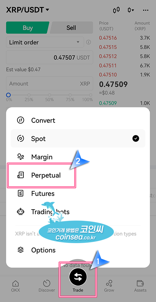 1. OKX앱의 맨 가운데 회전하는 화살표 표시를 한번만 클릭하면 현물거래가 오픈됩니다. 현물거래화면에서 다시 살짝 클릭하거나 약 2초 정도 누르고 있으면 거래 메뉴들이 나오는데 거기에서 Perpetual이 우리가 알고 있는 무기한 선물거래를 말합니다. Perpetual을 선택합니다.