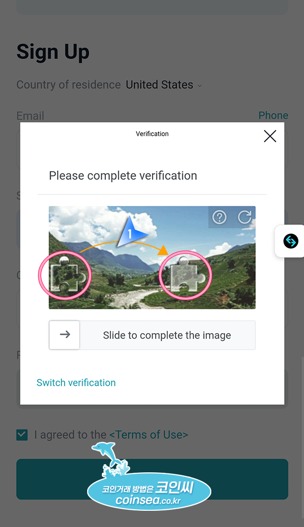 4. 자동가입 방지를 위한 인증화면입니다. 퍼즐 조각을 오른쪽으로 이동해서 조각을 맞혀주세요.