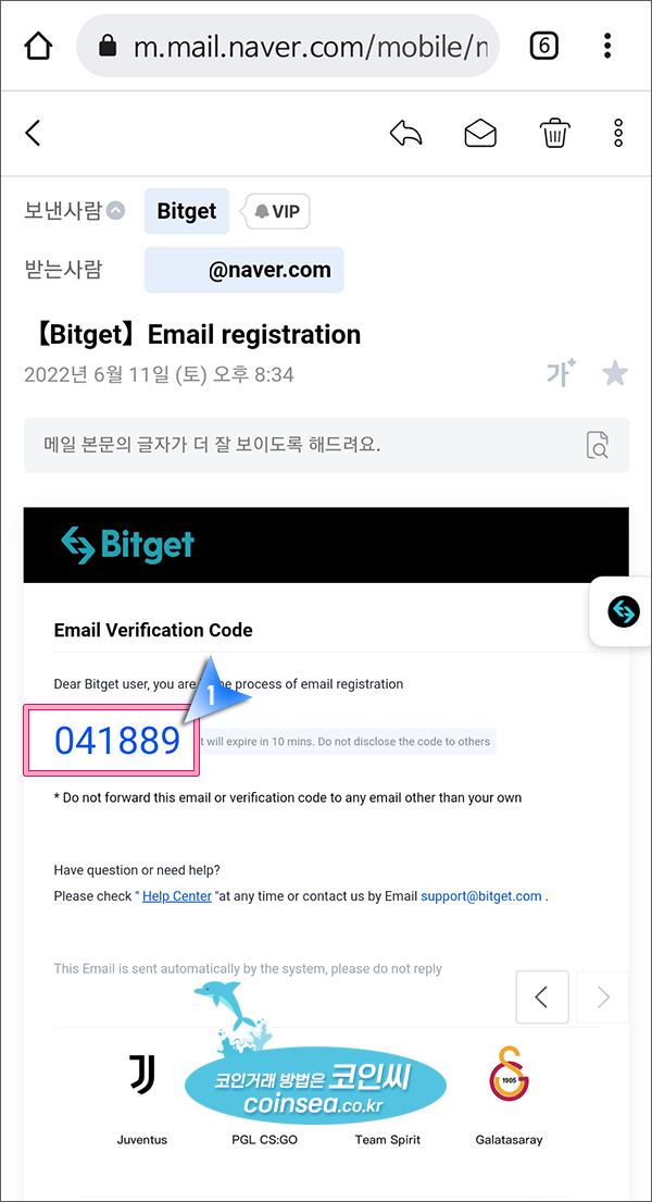 6. 이렇게 이메일로 비트겟 인증번호가 도착하면 6자리 인증번호를 복사해서 방금 전 화면에 넣고 인증해주시면 됩니다.