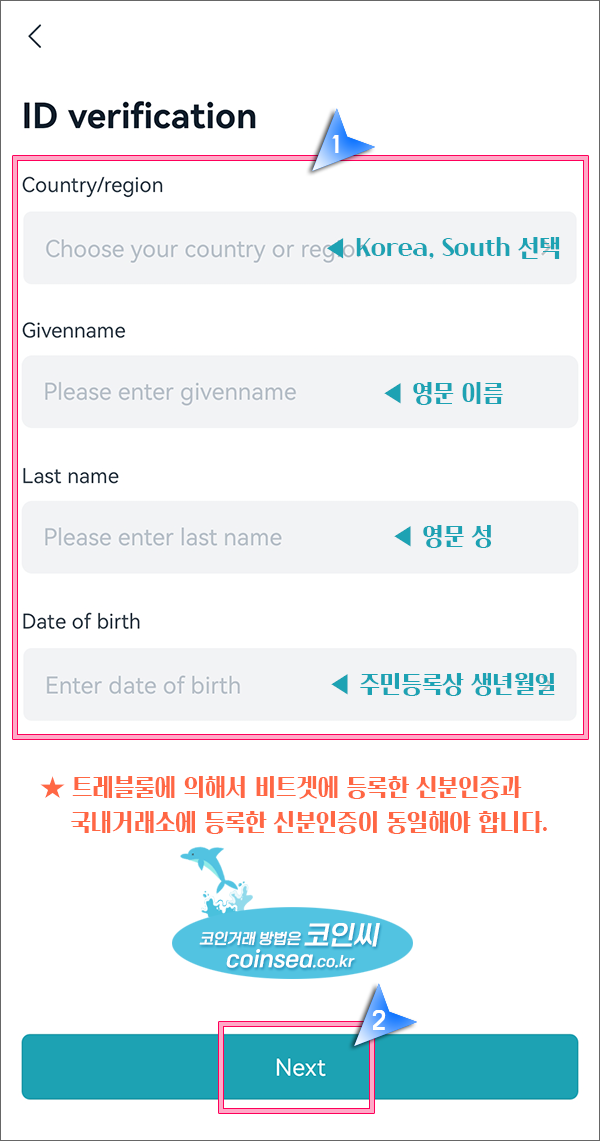 6. 국가에서 "Korea, South"를 선택하고 이름과 성은 영문으로 작성하시기 바랍니다. 아직까지는 한글로 작성을 해도 되지만 국내거래소와 트래블룰 인증시 한글로 작성하시면 오류가 많이 발생해서 국내 거래소에 등록된 자신의 영문명으로 동일하게 작성하시는 것을 추천드립니다.