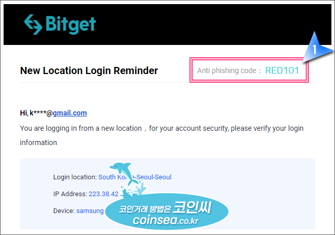 Anti-phishing Code(안티피싱 코드)는 고객정보 탈취를 목적으로 보내는 메일로 인한 피해를 예방할 수 있습니다. 아래 이미지처럼 자신이 정해놓은 문자가 메일 윗쪽에 표시되어 있어서 공식 비트겟에서 보냈는지 아니면 불법 피싱메일인지 확인이 가능하기에 함께 설정해두시면 좋습니다.