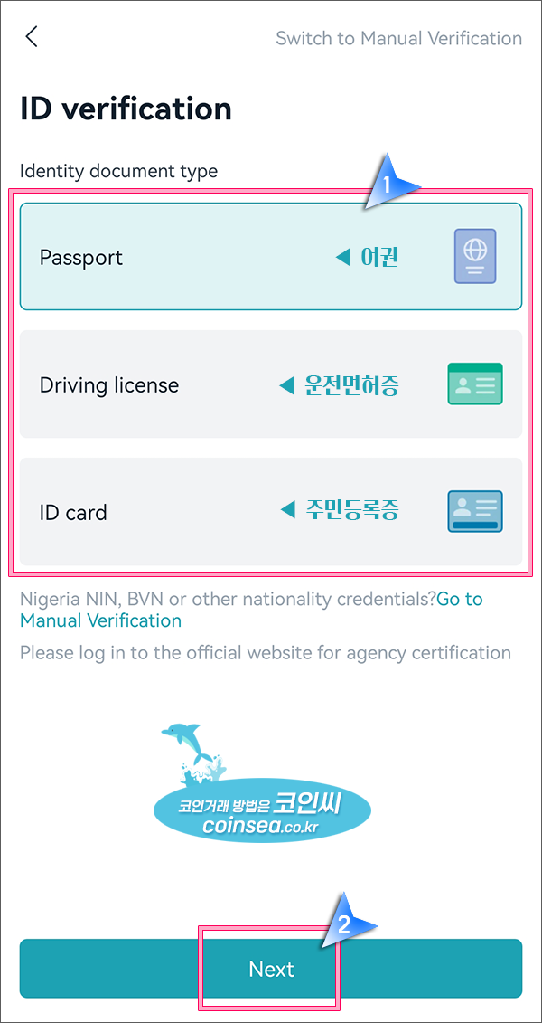 5. 여권, 운전면허증, 신분증(주민등록증)으로 신원인증이 가능하며, 여권을 가지고 계신분들은 되도록 여권으로 하시는 것이 인증이 빨리 됩니다. 신분증 종류를 선택하고 "Next"를 클릭합니다.