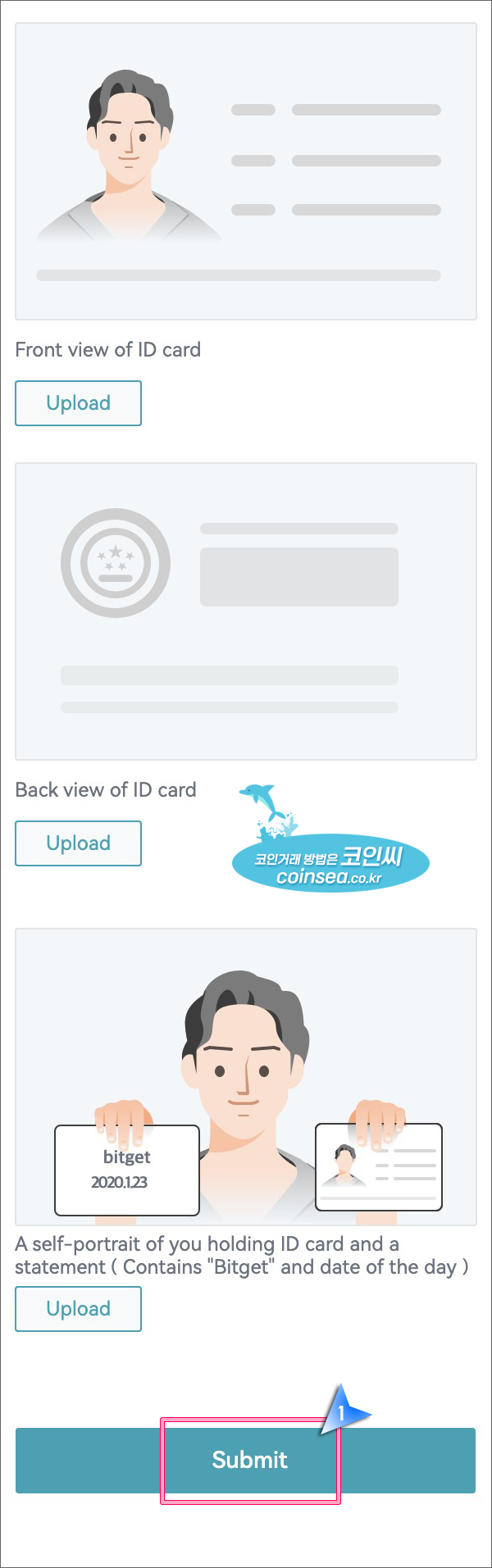 10. 신분 인증시 이렇게 신분증 앞뒷면을 업로드하고, bitget과 오늘 날짜를 적힌 메모와 신분증을 셀카로 촬영한 뒤 업로드를 요구하기도 하는데 원하는대로 인증문서를 업로드 해주시면 됩니다.