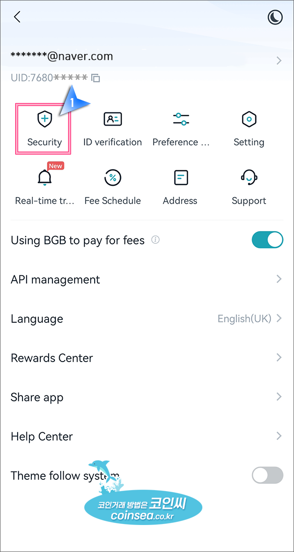 2. 우선 KYC 인증을 하기 전에 Security를 눌러서 보안 설정을 먼저 하도록 하겠습니다. 가상화폐 거래소에서 보안 설정은 자신의 소중한 자산을 지키는 마지막 수단임을 인식하시기 바랍니다.