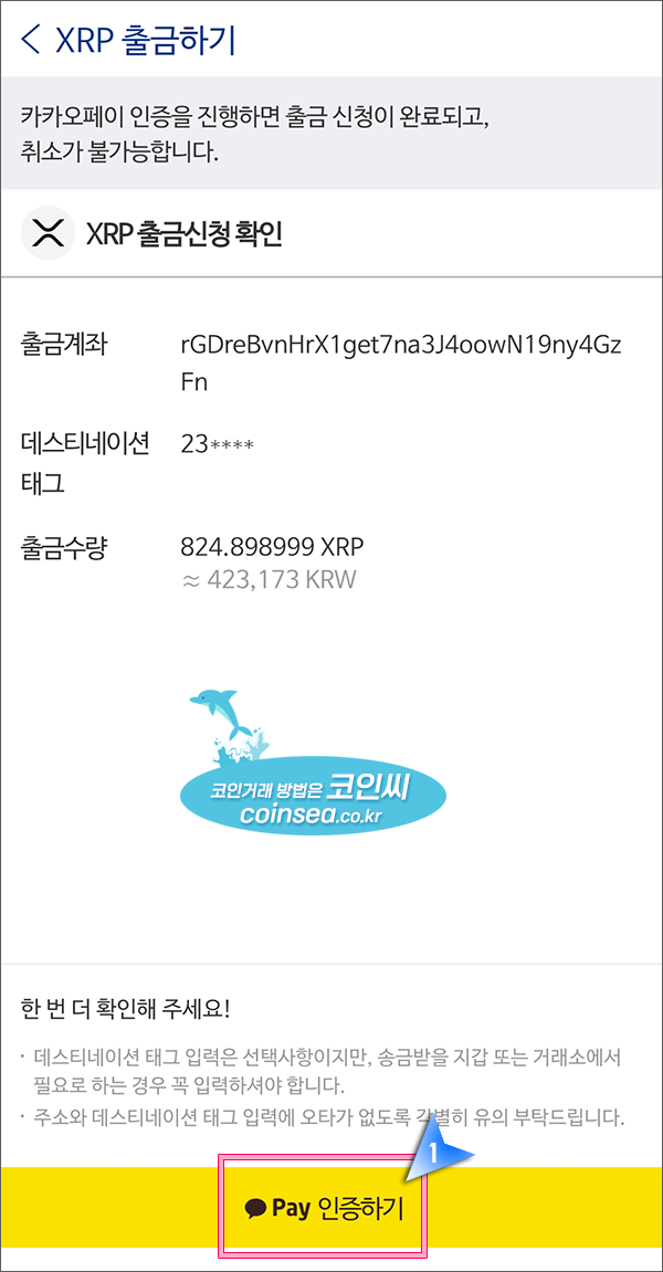 20. 모든 출금은 카카오톡 인증을 거쳐야 합니다. "Pay 인증하기" 버튼을 클릭하고 인증을 완료하시면 리플 출금이 완료됩니다.