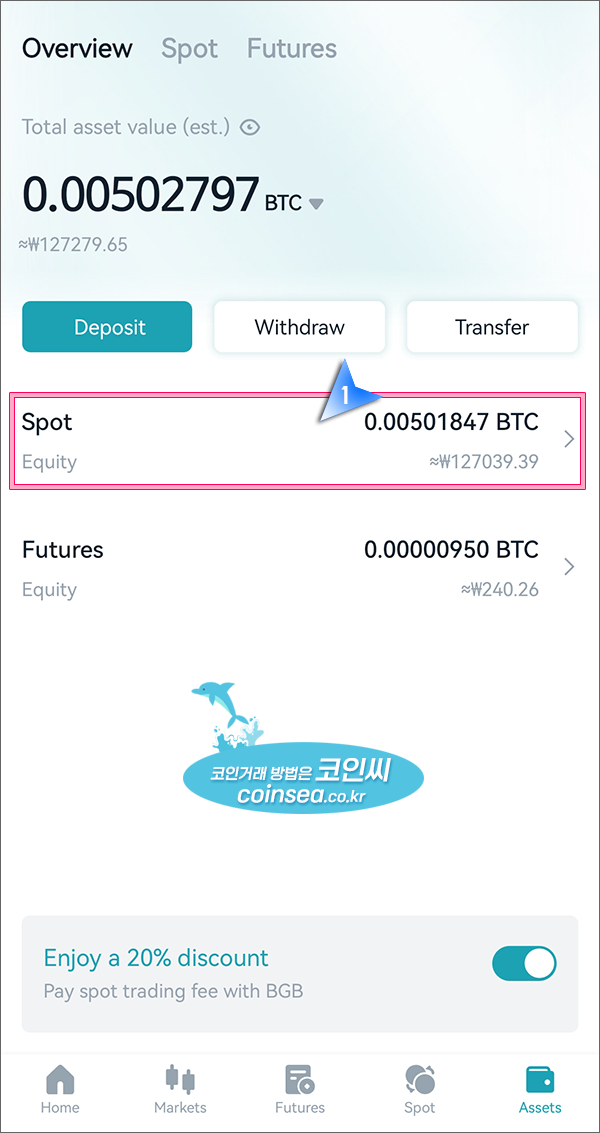 2. Assets(자산, 지갑)은 현물지갑(Spot)와 선물지갑(Futures)이 있습니다. 코인의 입출금은 현물지갑에서 이루어지므로 "Spot"을 클릭합니다.