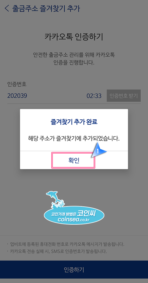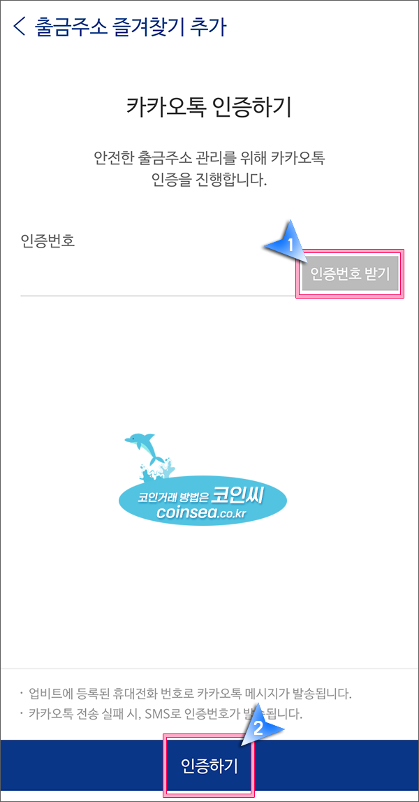 16. 출금 주소가 추가되면 카카오톡 인증을 거쳐야 합니다. "인증번호 받기"를 클릭해서 인증번호를 받아서 입력한 후, "인증하기"를 클릭합니다.