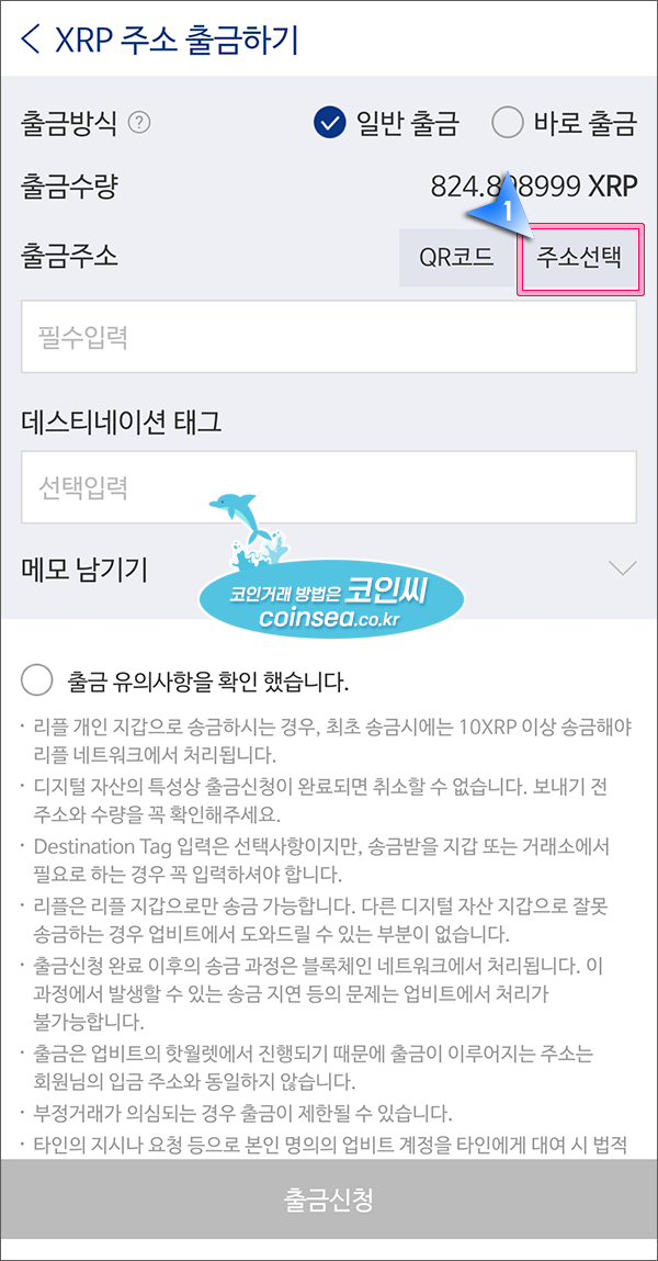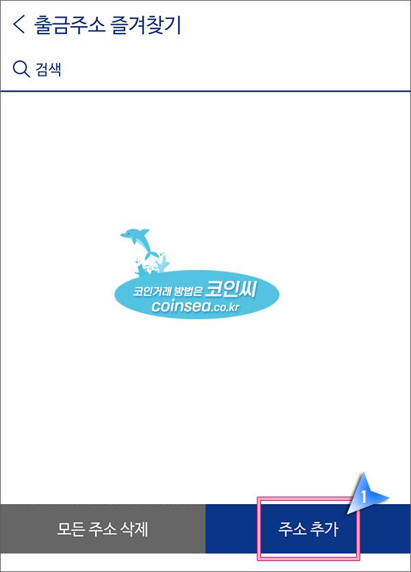12. "주소 선택"을 클릭해서 주소를 미리 입력해놓아야 나중에 간편하게 출금할 수 있기에 주소를 입력해 두겠습니다.