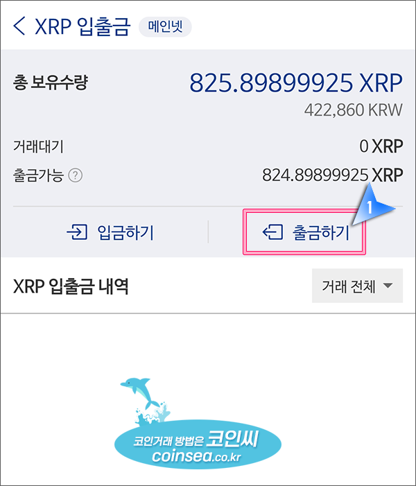 8. 리플을 출금하기 위해 제가 이용하는 업비트를 예로 들어보겠습니다. 먼저 업비트에서 전송할 금액만큼 리플을 매수합니다. 그리고 업비트 앱 하단의 '입출금'을 클릭해서 검색창에 "XRP를 검색"하여 나오는 리플을 클릭해주세요.