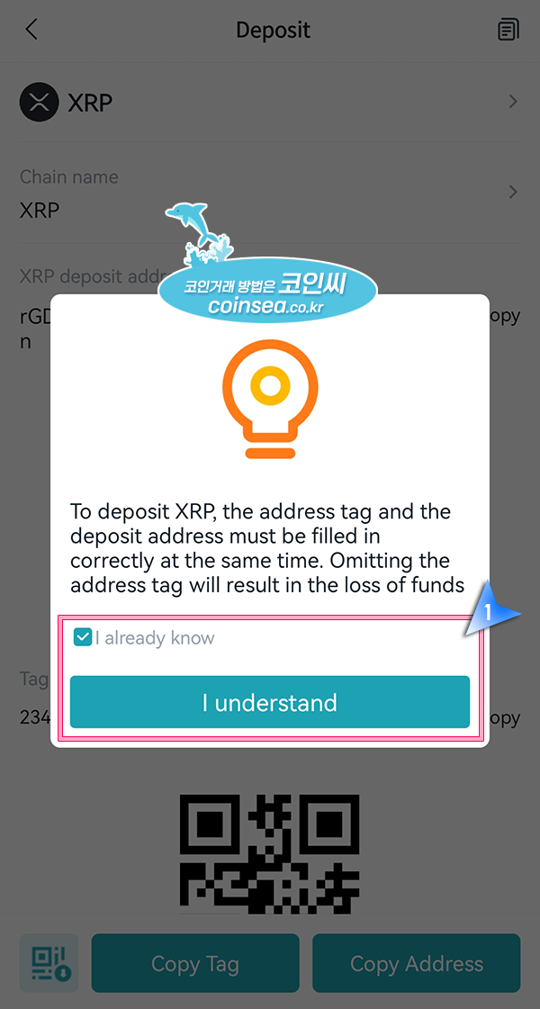 5. 리플은 주소 외에 태그도 입력해야 정상적으로 입금이 완료된다는 메시지입니다. "I already know"에 체크하시고 "I understand"를 클릭합니다.