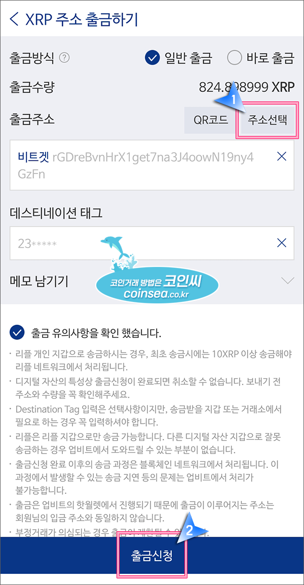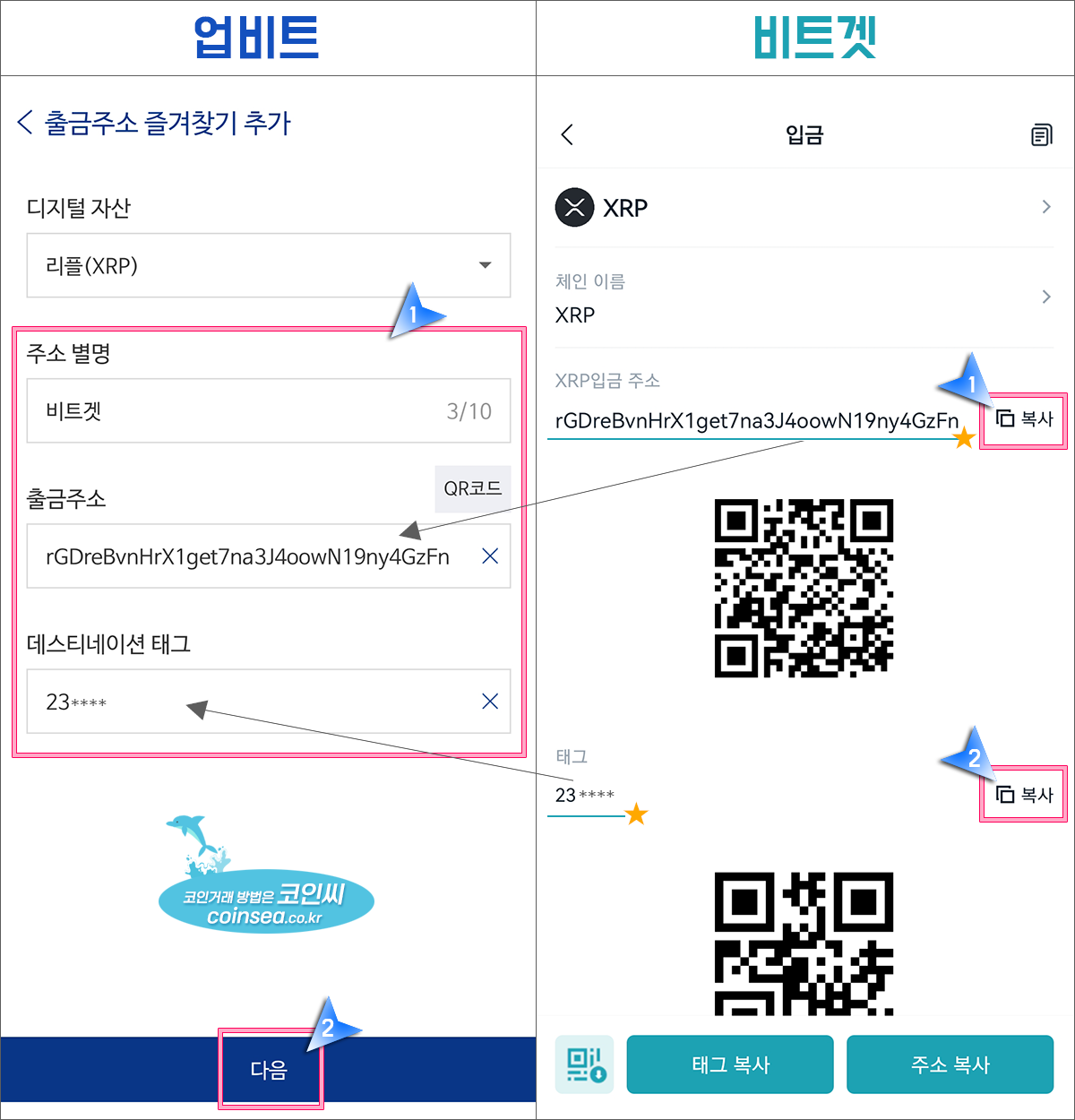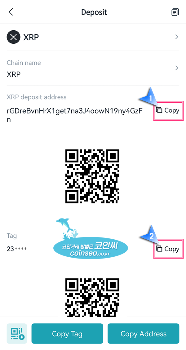 6. 리플의 입금주소와 태그를 각각 복사하여 국내거래소 리플 출금화면의 출금 주소와 태그(데스티네이션 태그)에 붙여넣기 하시면 됩니다. 국내거래소에서 비트겟 리플 출금주소를 등록하는 방법은 아래 자세히 나와있으니 따라하시면 됩니다.